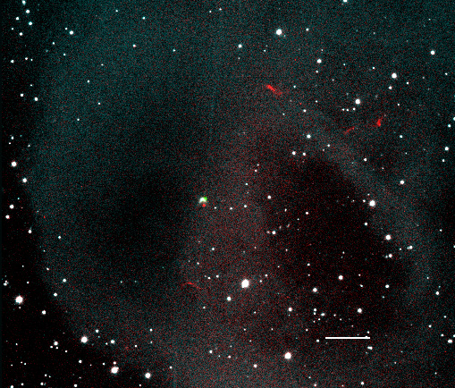 The protostar is in the middle, shown in white and green. It's not circular like the stars. You are seeing the reflection nebula of the protostar. Note the lack of stars to the left. That is due to the dark cloud blocking out the view to background stars. The Taurus cloud is very close-by, only 140 parsecs, or about 420 light years away. Most stars are much further away, so the dark cloud will block them out.