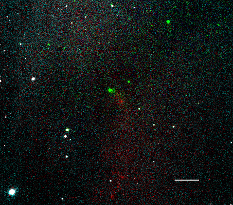 This source, at center, is invisible at wavelengths our eyes, and the telescope we used, can see. So we put in green an infrared image which shows then central protostar. Notice very few white (optical) stars in the field. Notice however, the very faint jet curving out from the central source. It would probably be brighter but it too is being extincted by the dark cloud. It is neat looking though. Why does it curve? Is the central star changing the direction at which is squirts out the jet, or is the jet being curved by it's environment, like the way light changes direction when it goes through different media (like air and water).